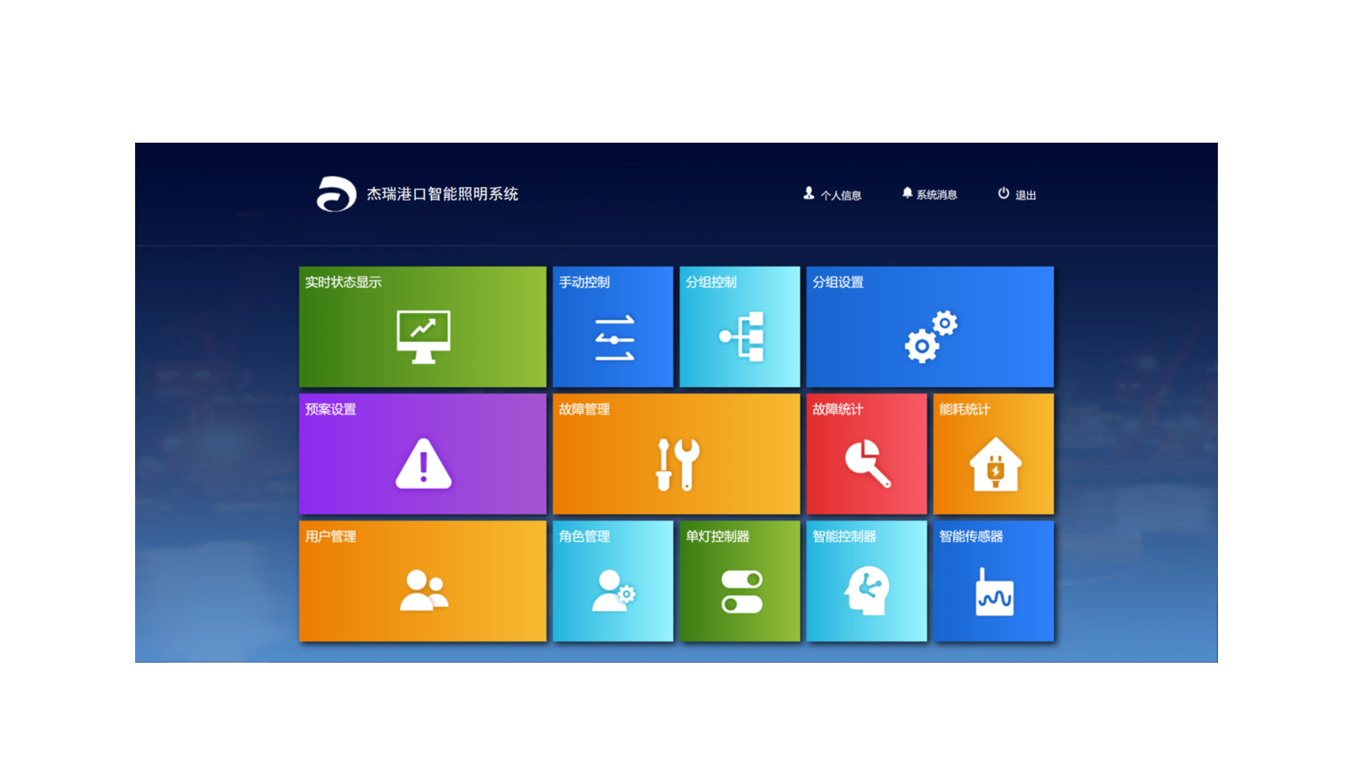 杰瑞智慧照明系统JR-LCS-Smart2000是杰瑞针对港口岸桥和堆场、厂房等作业区域的照明特点,利用云计算、大数据、人工智能、视频检测、嵌入式与物联网等技术设计开发的全新一代自适应智慧照明系统。系统具备智能控制和高效节能两大特点,实时感知作业区域内的人、车、环境,支持与企业生产调度系统对接,实现作业区域内的自适应照明,达到高效节能目的。系统兼具灯具状态实时显示、灯具故障实时推送、能耗大数据实时统计、控灯预案自主可调等多种功能,满足企业对照明系统的精细化管理。系统包含:智能照明管理平台、智能灯具控制器、高稳定性LED灯具(内含单灯控制器)、高精度传感器等一整套软硬件设备,同时拥有桌面Web端和手机端两种管理方式。